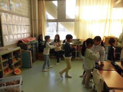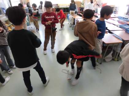 1年生の生活の授業で昔あそびをしました。教室でコマまわし、お手玉、けん玉、めんこなどの伝統的な遊びで楽しみました。コマまわしでは、ひもをコマに巻き付けるのが難しく、悪戦苦闘しながらも何度も何度も練習したり、けん玉が得意な子がお友達にコツを教えて、一緒に練習していました。一生懸命に取り組み、体もぽかぽかになり、上着を脱いで取り組む様子も見られました。昔あそびのよさを体全体で感じ取ることができたようです。保育園のお友達とも昔あそびで楽しむ予定があるそうです。