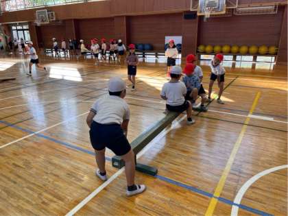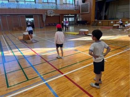 2年生が体育館で跳び箱に取り組んでいます。「手をつく所は跳び箱の前の方がいい」「踏み切りはバンッと音が出るように」と声をかけ合っていました。笑顔がたくさん見られて、楽しそうに取り組んでいます。