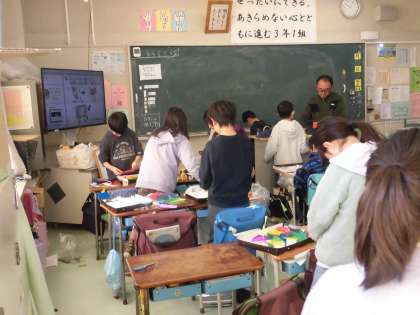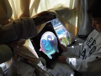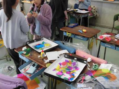 3年生の図工では「光サンドイッチ」の制作をしています。トレンシングペーパーやカラーセロハンなどの光りを通す材料を使って、光とかげの美しさをいかした飾りを作っています。色鮮やかなセロハンを使い、装飾することで、冬の光を浴びて、キラキラ光ったり、少し柔らかみのある色合いが浮かび上がり、とても素敵な作品になりました。