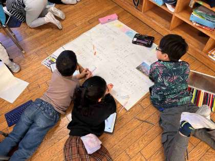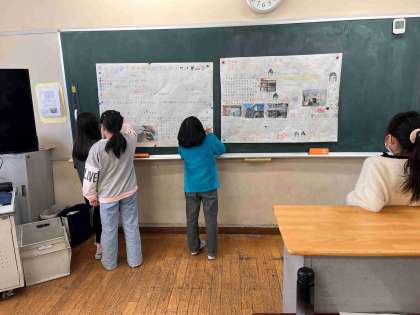 3年生は総合的な学習の時間で、自分たちの住む町について調べています。里山や野川、商店街、図書館など、テーマを決めて調べました。調べたことをグループでまとめています。3学期もさらに学習を深め、自分たちの町のことをさらに知っていく予定です。