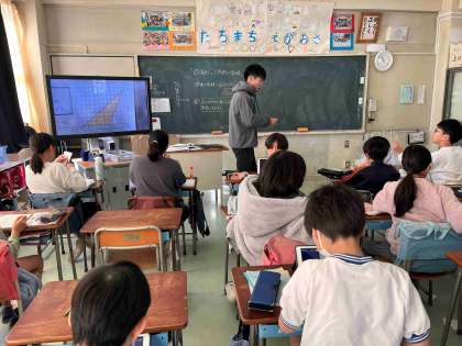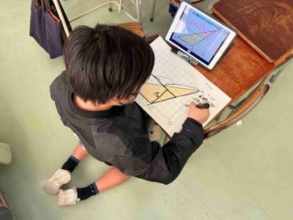 5年生が算数で三角形の面積の求め方を考えていました。公式は「底辺×高さ÷2」ですが、どうしてそのような公式になるのか、平行四辺形の面積から考えたり、底辺と高さの関係について調べたりしていました。一人で考えたアイディアを共有して、みんなで共有していきます。これからは、台形の面積について考えていきます。これまで学習したことを生かして身に付けてほしいと思います。