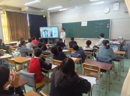 その後、留学生から自己紹介をしてもらいました。出身国の紹介、街の様子、食べ物、名所、日本に勉強しに来た理由など、教えてもらいました。6年生は、メモを取りながら熱心に聞いていました。いくつかの質問にも答えていただき、有意義な国際理解の時間となりました。