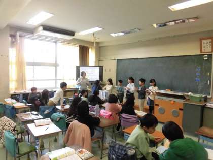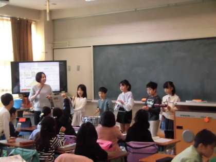 2年生の音楽では、いろいろな打楽器を使い、音を重ねて演奏する学習をしています。グループに分かれて、カスタネット・ウッドブロック・クラベス・すず・トライアングル・小だいこの担当に分かれ、曲に合わせて順番に音を重ねて演奏しました。徐々に打楽器の音が重なり、とてもきれいな歌声と打楽器のきれいな音色が教室に広がりました。