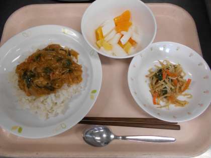 豚キムチ丼(麦ごはん) ナムル 杏仁豆腐 牛乳
