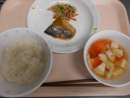 ごはん さばのみそ煮 ごま酢あえ じゃがいもとえのきのすまし汁