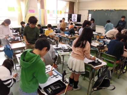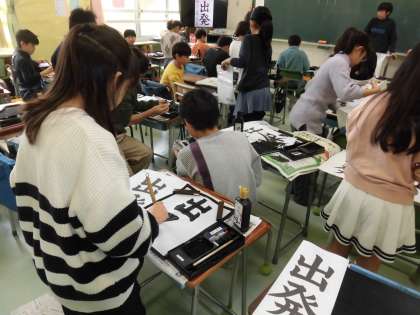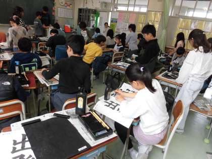4年生の書写では、毛筆で「出発」の字の練習をしました。筆先は墨汁でよく整え、筆を立てて、今まで学習してきたポイントを思い出しながら練習しました。納得がいく字が書けるまで、何度も何度も練習する様子が見られました。心を落ち着かせて、半紙に向かう姿はとても集中力があり、真剣なまなざしでした。とても力強く「出発」の文字を書くことができました。