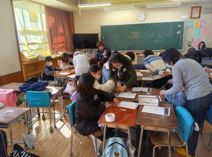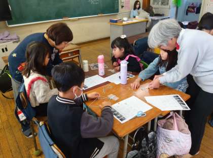 講師の先生方に教わりながら、ひもを編んでいきます。家ではなかなかできない経験で、子どもたちは悪戦苦闘していました。難しそうですが、完成の喜びは大きいと思います。