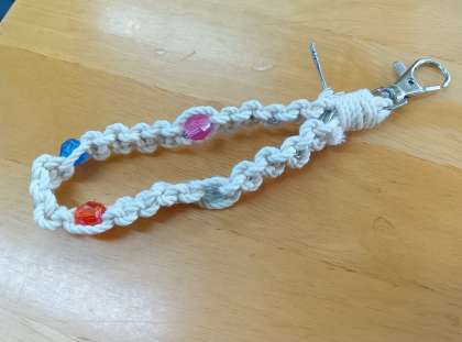 マクラメキーホルダー作りを教わっています。