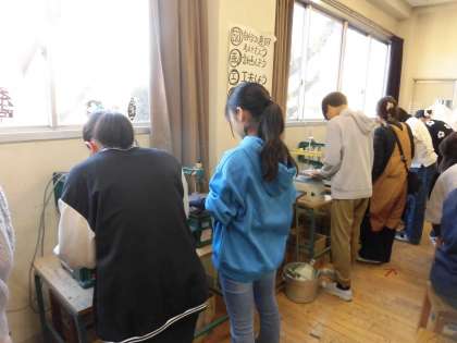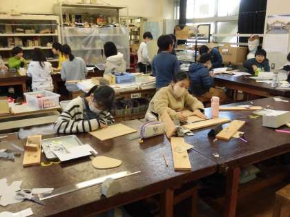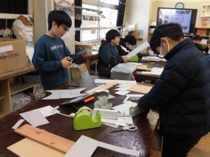 6年生の図工では「マイボックスを作ろう」の学習が進んでいます。小物入れや、宝箱など、自分の思い描く箱を設計しました。今日は画用紙でサンプルを作り、出来上がったらサンプルをもとに木にうつして、手引きのこぎりや電動のこぎりで切っていきました。「切る」「くりぬく」「貼り付ける」など、学んできた技をいかして箱作りのデザインを考え、制作に取り組んでいます。