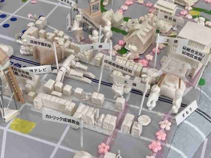 「成城の歩み100年」の展示にある模型にある「明正小学校」を見付け、「あった!学校!!」と歓声が上がりました。模型には、昔のまちの様子が表現されています。成城学園前駅の近くには、土俵があったそうです。今では想像がつきません。成城ホールの4階スペースに展示されています。