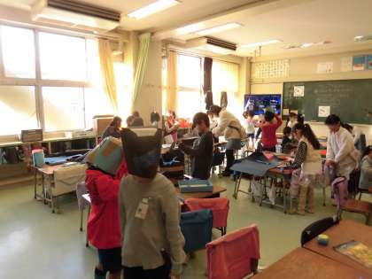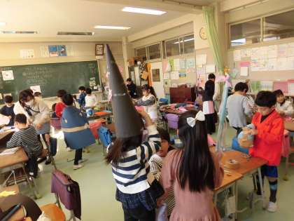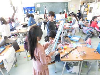 1年生の図工で「つくってへんしん」の学習をしました。変身したいものを考えて、色画用紙やビニール紐などを切ったり貼ったり、工夫して使用し、へんしんグッズを作りました。とんがり帽子、きらきらステッキ、マントなどなど、たくさんのへんしんグッズが出来上がりました。みんなで変身して、まるでファッションショーのようでした。