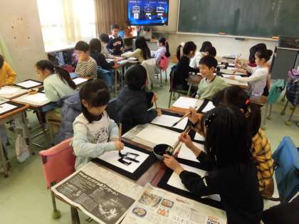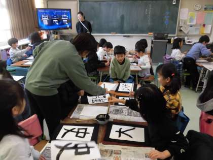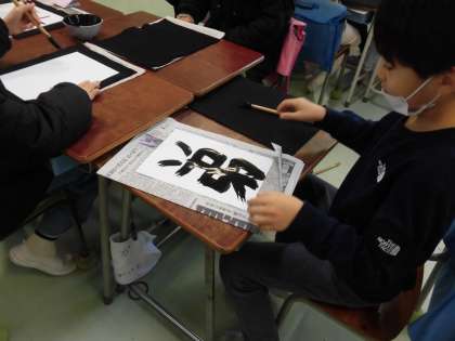2年生の国語で好きな漢字一文字を毛筆で書きました。自分の名前にちなんだ漢字を書いたり、画数の多い漢字に挑戦する様子も見られました。「大」「楽」「咲」「高」など、とても力強く、とても優しく書くことができました。どの字も趣深い仕上がりになり、年の初めにとても良い学習となりました。