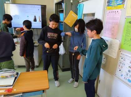 一人一人がふりこを手作りし、メトロノームに合わせてふりこを振っています。