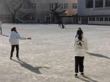 6年生が校庭で、むかし遊びの羽根つきやけん玉を楽しみました。羽根つきは伝統的な正月遊びですが、親しむ機会も少なくなりました。6年生も、最初は苦戦している様子も見られましたが、しばらくすると、だんだん慣れてコツをつかみ、校庭に羽子板に羽根がつく音が響き、楽しむことができました。