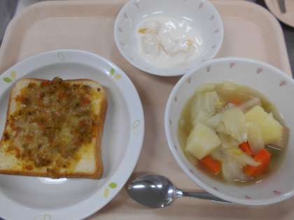 ドライカレートースト 冬野菜のポトフ ピーチヨーグルト 牛乳