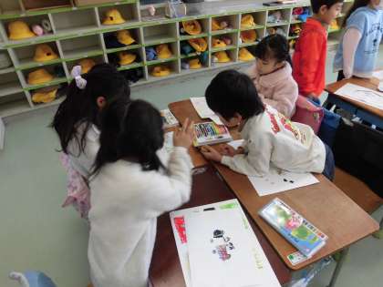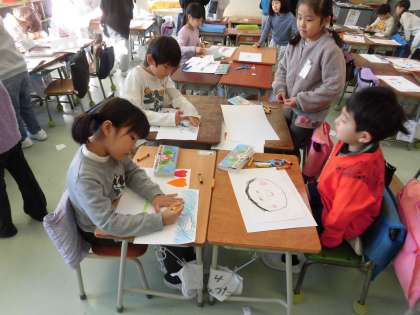 1年生の図工で「すてきなもようを見つけたよ」の学習をしています。画用紙を半分に折り、折った方を切って穴をあけ、穴のまわりにクレパスで絵を描きました。違う画用紙には模様を描いて、穴をあけた画用紙を重ねて穴をでのぞくと、穴の中に、素敵な模様が生まれました。