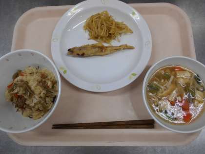 豚肉とごぼうのごはん ししゃもの天ぷら