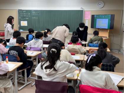 4年生は算数で面積について学習しています。まず単位を知り、単位数使うよさに気付きました。正方形や長方形の面積の求め方を身に付け、それを生かして複合図形の面積を求めていますが求め方は一つではなく、いくつかあるようですね自分の考えた求め方を友達と共有し、考えを深めていました。