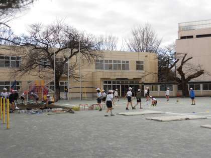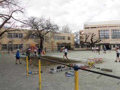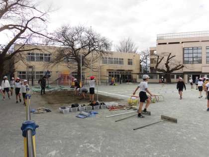 5年生の体育では、校庭で「走り幅跳び」の学習が始まりました。5歩くらいのリズミカルな助走から踏み切って、思いっきり跳ぶ練習をしています。助走から踏切、着地までを自分のやりやすいリズムを繰り返し練習して確かめていきました。砂場をならしたり、準備や片付けも分担し、協力して行っています。