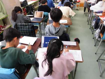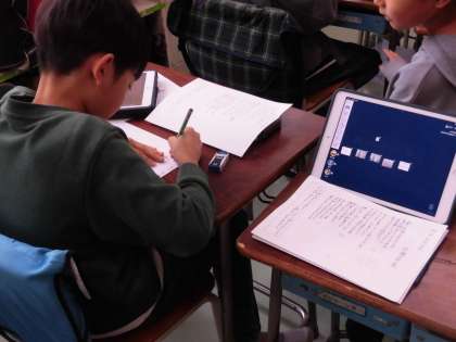 4年生の国語で、自分だけの詩集づくりをしています。詩の学習では、たくさんの詩に親しみ、詩を読む楽しさを味わっています。今日は、今まで読んだ詩の中から好きな詩をいくつか選び、自分だけの詩集づくりを行いました。自分だけのテーマを決めたり、それぞれの詩に対する感想や考えをまとめることで、また改めて詩の良さを感じることができたようです。タブレットで自分だけの詩集の内容をまとめ、清書は1枚1枚とても丁寧に書くことができました。