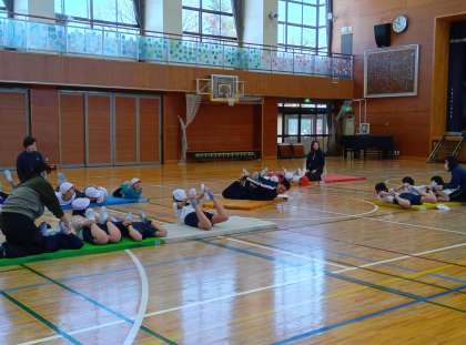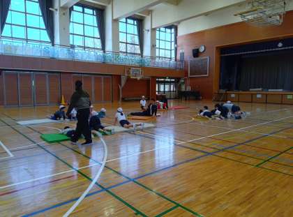 マットを使った運動遊びをしました。新しく、ねこちゃんたいそうをしました。ねこになりきって、背中を丸めたり伸ばしたりする運動です。