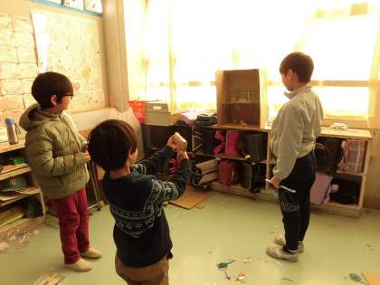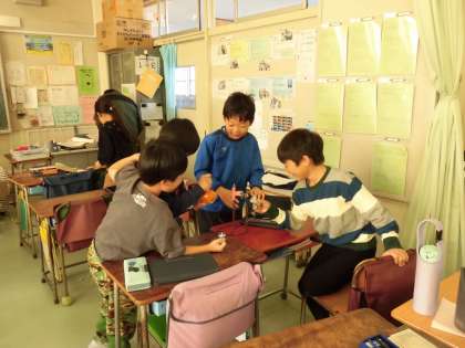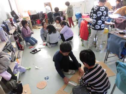 3年生の理科では学習してきたことをいかしたおもちゃ作りをしています。風やゴムの力のはたらきや豆電球、乾電池、磁石などを利用し、工夫を凝らしたおもちゃを制作しています。ゴムの力を使用した的あてや、磁石の力を利用したUFOキャッチャーなど、グループで相談しながらアイディアを出し合いました。実際に自分たちで遊んでみては改良を重ねていました。グループでとても楽しく制作を進める様子がみられました。おもちゃが出来上がったら、理科のおもちゃのお店屋さんが開く予定です。