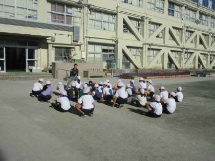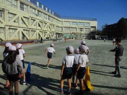 4年生は体育でハードル走に取り組んでいます。まず、ハードルの無い状態で走り、そのあとに小型のハードルを置いて走りました。ハードルがあっても、跳ばずにまたぎ越すように気を付けていました。冷たい風が吹いていましたが、準備運動で体を温め、元気に取り組んでいました。