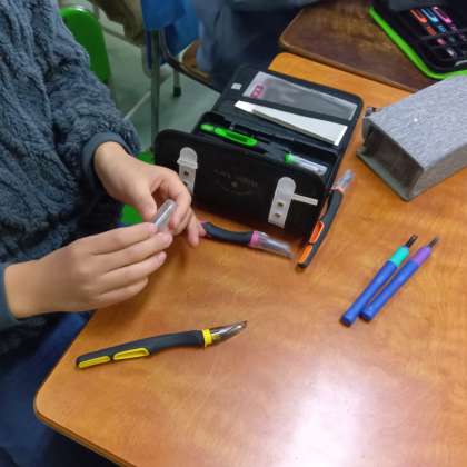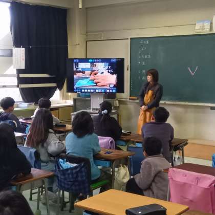 彫刻刀の安全な使い方の説明を聞き、実際に手にとって確かめました。そして、図工の先生が作った動画を見ながら、彫刻刀の使い方を見て学びました。けがをしない持ち方の練習もしました。持ち方を実践し、けがなく学習してほしいです。