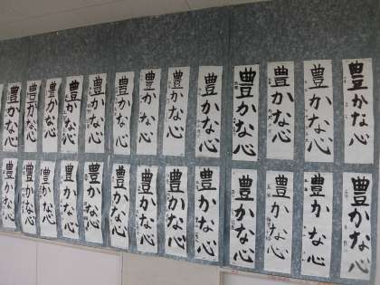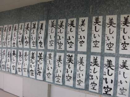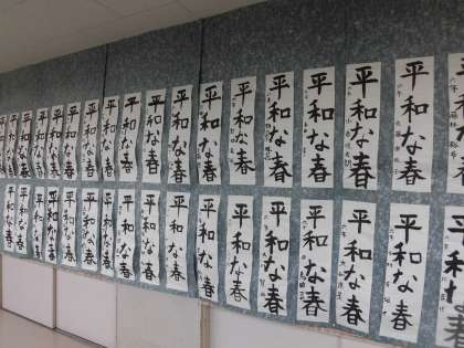 4年生の「美しい空」、5年生の「豊かな心」、6年生の「平和な春」の作品です。今までの毛筆の練習の成果を存分に発揮した、とても力強い作品がそろいました。6年生にとっては、小学校生活最後の書き初め展となり、一画ずつ丁寧に筆を動かし、力強さの中にも柔らかさが感じられる作品に仕上がっています。思い出深い書き初め展になっているようです。