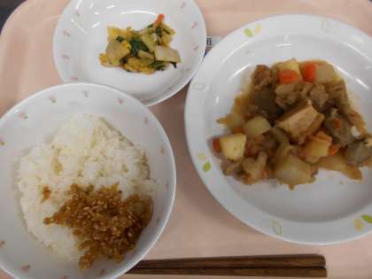 ごはん ごまたくあん 五目うま煮 白菜のおかかあえ 牛乳