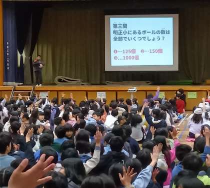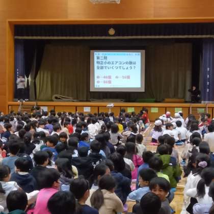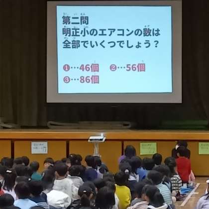 集会委員会による、児童集会の様子です。明正小に関するクイズが次々と出されました。明正小には、エアコンが何個ある?明正小には、ボールが何個ある?などなど興味深い問題で、とても楽しい集会となりました。