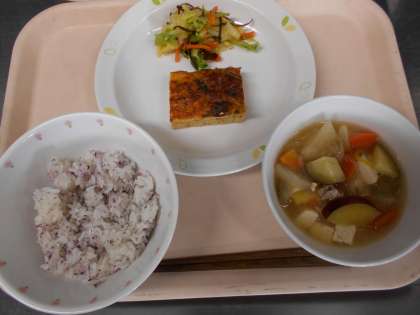 ゆかりごはん 卵焼き 野菜の塩こんぶあえ さつま汁 牛乳