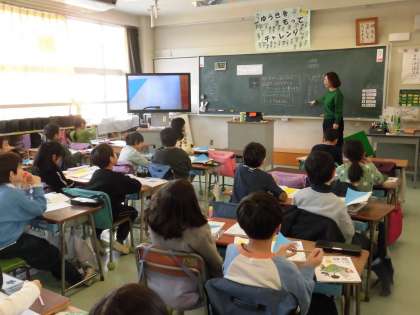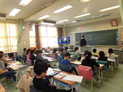 2年生の算数では「分数」の学習がはじまりました。折り紙を使って、半分にした大きさについて考えました。半分の大きさを「二分の一」といい、1/2と書くことを学びました。これまで、1000や10000といった大きな数を学習してきましたが、1より小さな数を表すことができることに驚く様子もみられ、興味津々で先生の話を聞きました。