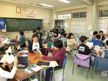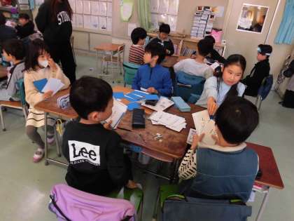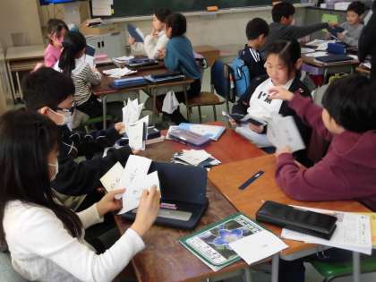 3年生の算数では「分数を使った大きさの表し方」について学習しています。今日は分数の学習の定着をさらに図るために分数カードを使ったゲームを行いました。トランプゲームのババ抜きの要領で、順番に隣の人のカードを一枚ずつとり、「足すと1」になるカードを捨てていき、手元のカードがなくなったらあがりです。取ったカードと手元のカードを見て即座に計算して1にならないか確認することができました。どのグループも盛り上がり、とても楽しく分数を学習することができました。