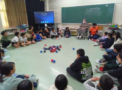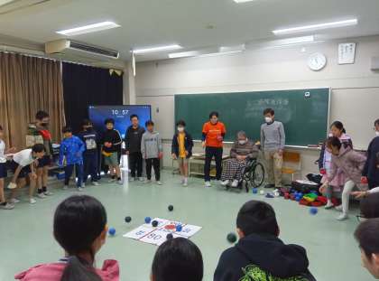 身体障害を学習するグループでは、輝水会の方と車椅子の方を講師にお招きしました。一緒にボッチャを楽しみ、様々なことを感じていました。