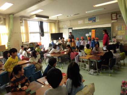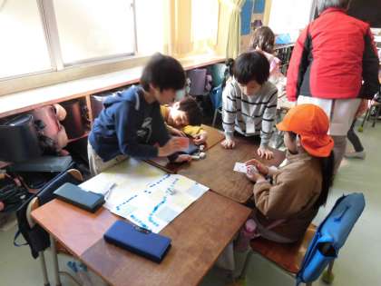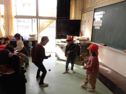 1年生の生活で、保育園のお友だちとお正月あそびで交流しました。お手玉、けん玉、おはじき、こま、めんこなど、グループに分かれて楽しみました。1年生が遊び方を教えてあげる様子も見られました。今日の保育園交流のために、一生懸命に準備してきました。自分たちで作ったすごろくも大人気だったようです。楽しい時間はあっという間で、最後は「また遊びに来てねー」とハイタッチをしていました。