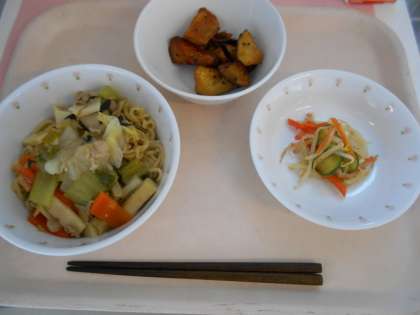 チャンポン麺 もやしの中華あえ 大学いも 牛乳