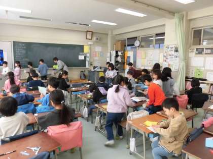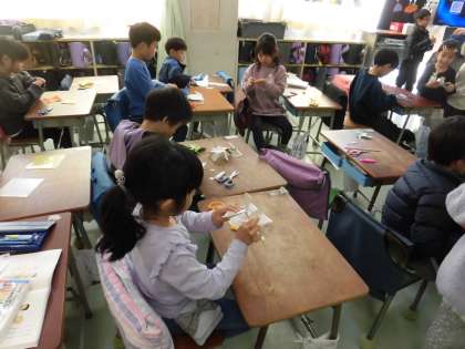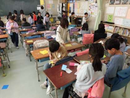 1年生の生活の「風とあそぼう」では、かざぐるま作りをしています。先日、折り紙を使ったかざぐるまを作り、風に乗せてクルクルまわして遊びました。今日は、紙コップなど、他の材料を使ってかざぐるま作ることに挑戦しました。どのようにしたらクルクルよく回るかざぐるまができるのか考えながら、一生懸命に取り組みました。