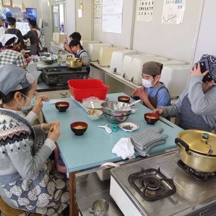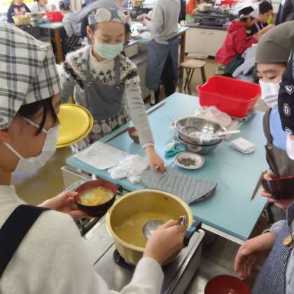 5年生、家庭科「みそ汁のつくりかたを調べよう」調理実習の様子です。班のみんなで協力して、伝統的な日常食である味噌汁を作っています。出汁の取り方や野菜の切り方、具を入れる順番など安全に気をつけながら調理しました。みんなで作って食べた味噌汁「はじめて自分で作ったのでとってもおいしいー」いう感想でした。
