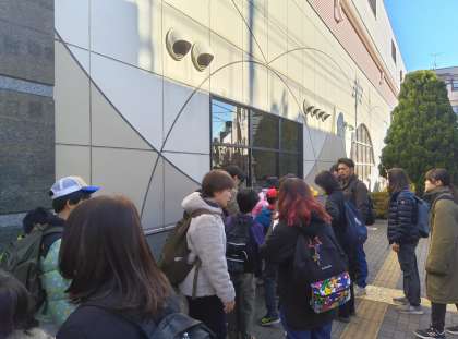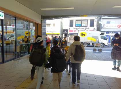 梅ヶ丘駅までグループごとに来ました。到着して、「〇〇グループ全員います」と報告してくれました。ここからは手つなぎペアで伝統工芸室に向かいます。