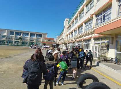 体験を終えて明正小に帰ります。手つなぎペアで歩いています。帰りはみんなで帰ります。
