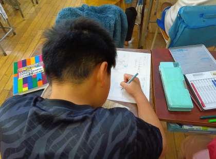 「遠足だ 遠くに行けて うれしいな」や「羊毛がふわふわしてる 羊さん」のように、同じ漢字の音読みと訓読みを使ってかるたを作りました。指を折りながら文字数を数えて、リズムのよさを意識していました。