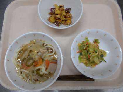 けんちんうどん 野菜のごま和え 大豆といもの甘辛あげ 牛乳