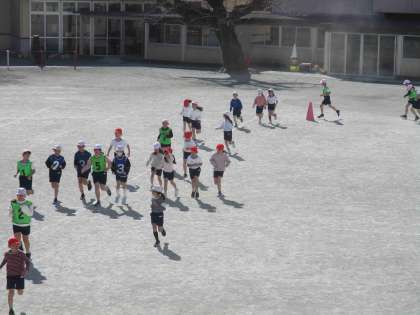 体力づくりでは、短縄跳びだけではなく、持久走にも取り組んでいます。決まった時間に、自分のペースで走り、持久走のカードに色を塗ります(小田急線のカードです)。体育の授業のはじめには、異なる学年の子どもたちが一緒に走っていました。上級生が下級生に励ましの声をかける姿も見られます。体を動かすことを楽しみ、体力づくりに取り組んでほしいと思います。