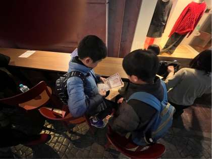 お昼ご飯はフードチケットで食べたい物を選んで食べます。「次は何をしようかな?」と相談もしているようです。