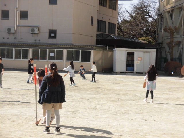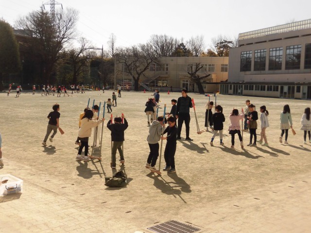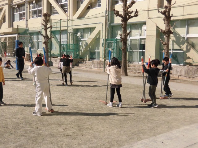 2年生が日本語の授業で昔あそびを楽しんでいます。今日は校庭で、羽根つきや竹馬をしました。羽根つきも竹馬も初めて挑戦する子も多く、先生にコツを教えてもらいながら練習しました。羽根つきの「カーン、カーン」というきれいな音がなり、「おもしろい音がする!」という声や、竹馬で1歩2歩と進んで「できた!」と大喜びする声が聞こえてきました。日本の伝統的な遊びに親しむことができました。
