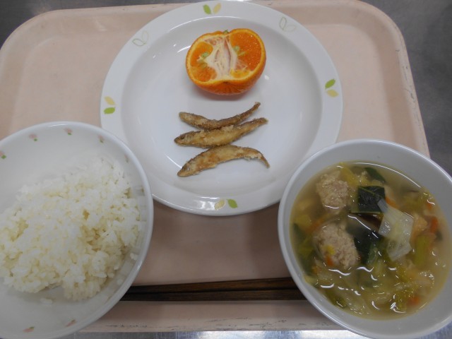 ごはん わかさぎのからあげ 白菜と肉団子のぽかぽか汁 ぽんかん 牛乳