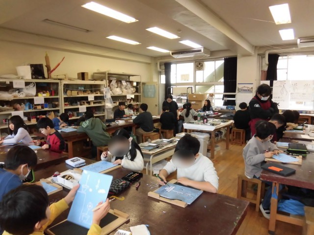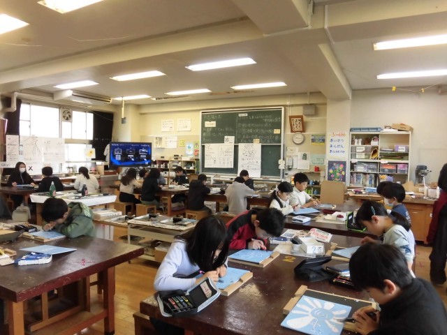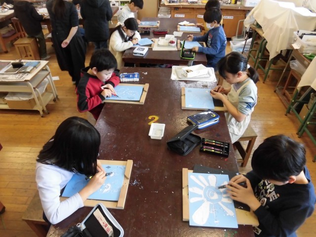 4年生の図工では「彫って表すふしぎな花」で彫刻刀を使った作品の制作をしています。線の強弱や全体のバランスも考えて彫り進めています。3学期から始まった彫刻刀の学習もなれてきて、安全に十分気をつけて取り組むことができるようになってきました。丸刀や角刀などの特徴もしっかりと理解し、線の太さに工夫をしながら作品作りをしています。