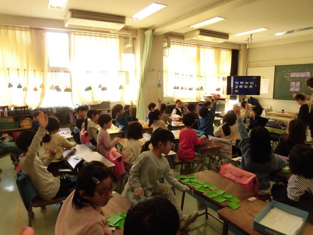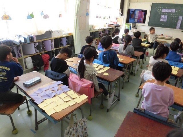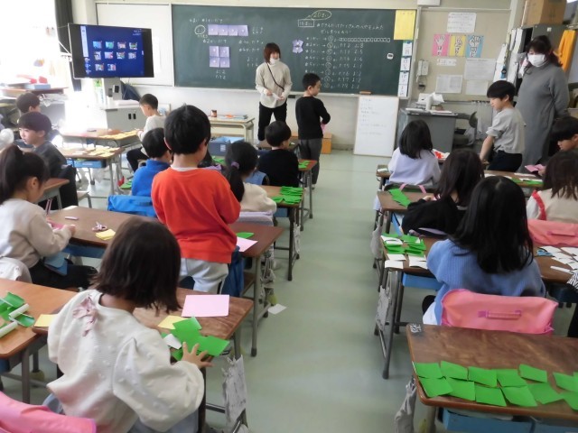 1年生の算数で16枚の正方形の紙を並べて、2階建て、3階建て・・・とだんだん大きなビルを作りました。形を変えて、できるだけたくさんの部屋があるビルも作りました。そこから、部屋の数を数える足し算の式を考えました。折り紙の数を増やして、もっと大きなビルをつくることにも挑戦しました。パズルゲームのように楽しく算数を学習することができました。