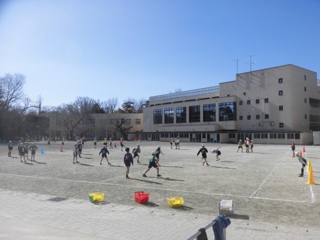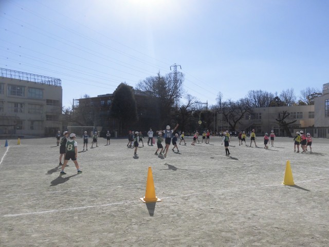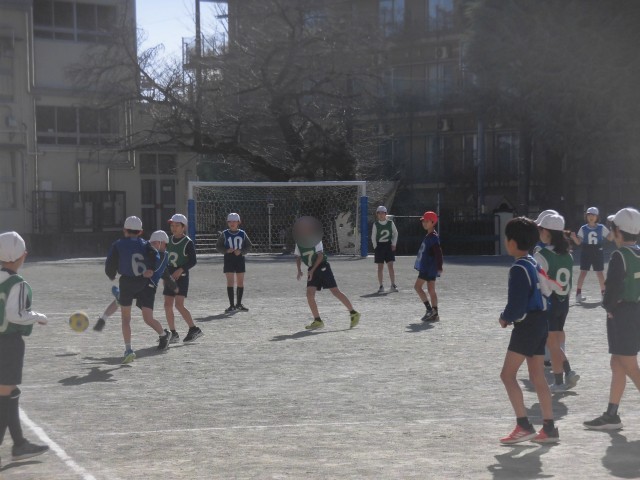 4年生が体育で「ラインサッカー」の学習をしています。チームで作戦をたて、声を掛け合って、パスをしてボールをつなげて得点を狙います。ボールを蹴る基本的な動作の学習だけではなく、パスを出しやすいように、シュートをうちやすいように考えて、素早く動いたりするチームプレーも大切に試合をしました。ルールを守り、ゲームを楽しむことができました。